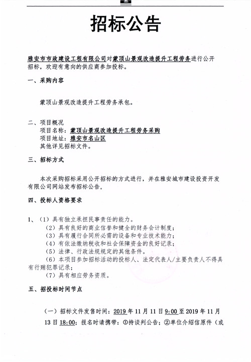 市政公司蒙頂山景觀改造提升工程勞務招標公告