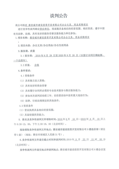 雅安城市建設(shè)投資開(kāi)發(fā)有限公司辦公文具、用品采購(gòu)項(xiàng)目競(jìng)爭(zhēng)性談判公告