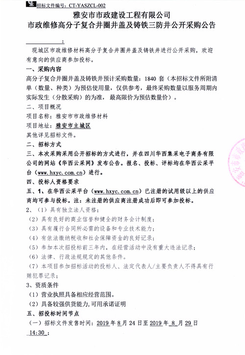 市政維修高分子復(fù)合井圈井蓋及鑄鐵三防井公開采購公告