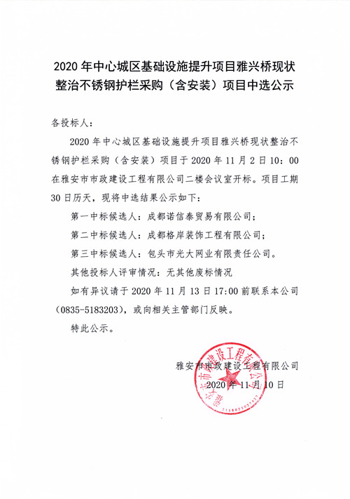 2020年中心城區(qū)基礎設施提升項目雅興橋現(xiàn)狀整治不銹鋼護欄采購(含安裝)項目中選公示