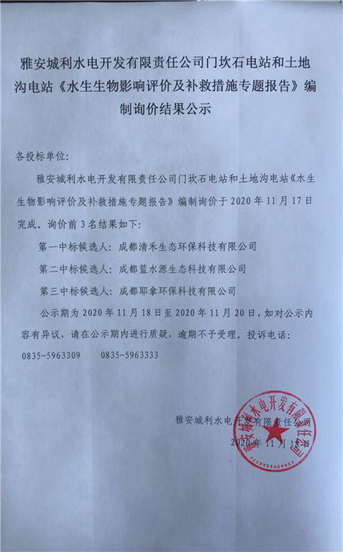 城利水電公司門(mén)坎石電站和土地溝電站《水生生物影響評(píng)價(jià)及補(bǔ)救措施專(zhuān)題報(bào)告》編制詢(xún)價(jià)結(jié)果公示