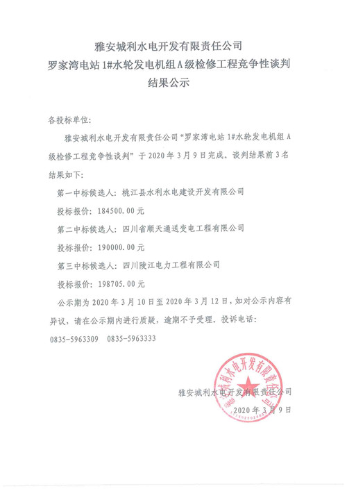 羅家灣電站1#水輪發(fā)電機組A級檢修工程競爭性談判結果公示