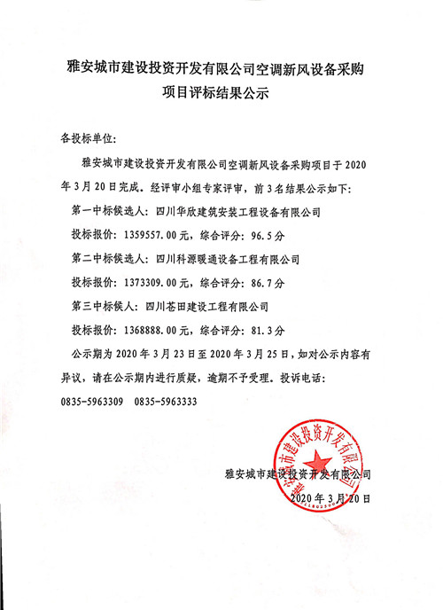城投公司空調(diào)新風設(shè)備采購項目評標結(jié)果公示