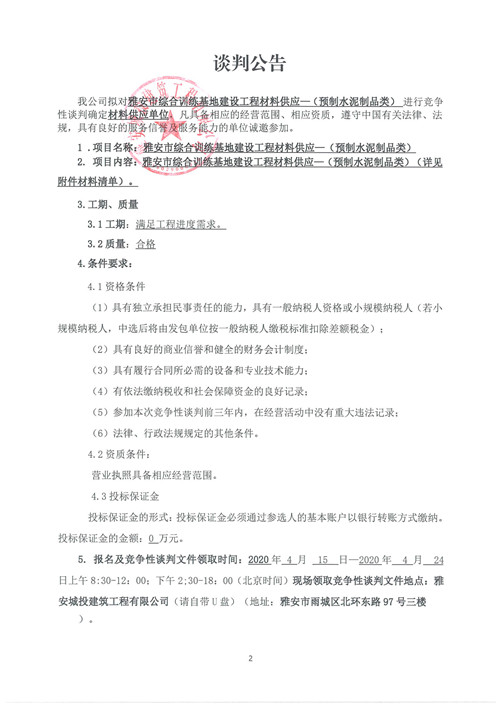 城投建工雅安市綜合訓(xùn)練基地建設(shè)工程材料供應(yīng)—(預(yù)制水泥制品類)競(jìng)爭(zhēng)性談判公告