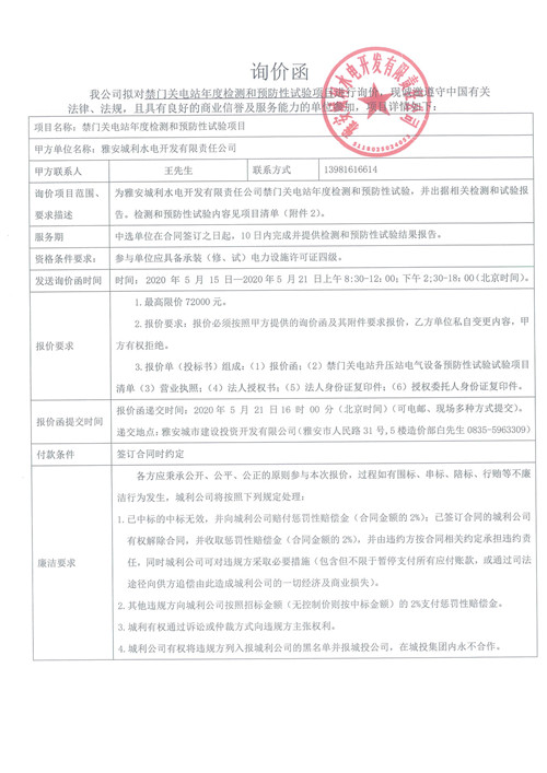 城利水電公司禁門關(guān)電站年度檢測(cè)和預(yù)防性試驗(yàn)項(xiàng)目詢價(jià)函