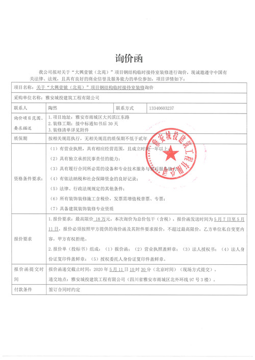 城投建工公司大興壹號(hào)(北苑)項(xiàng)目鋼結(jié)構(gòu)臨時(shí)接待室裝修詢價(jià)函
