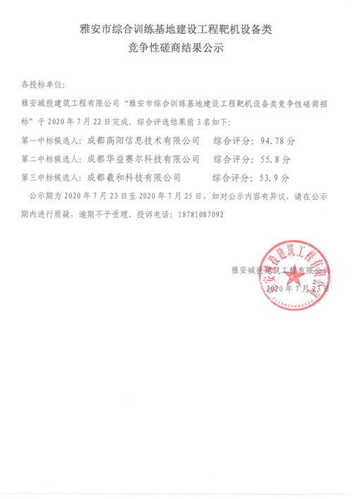 城投建工公司雅安市綜合訓(xùn)練基地建設(shè)工程靶機(jī)設(shè)備類競爭性磋商結(jié)果公示