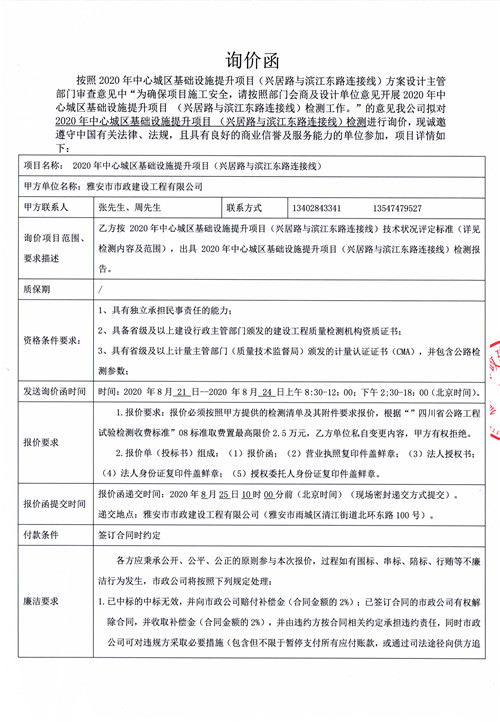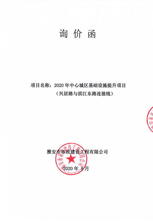 雅安市市政建設(shè)工程有限公司2020年中心城區(qū)基礎(chǔ)設(shè)施提升項(xiàng)目(興居路與濱江東路連接線)詢價(jià)函