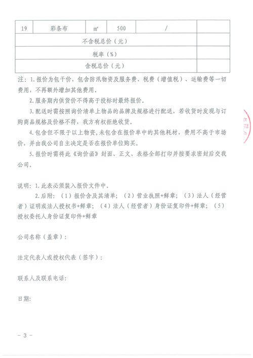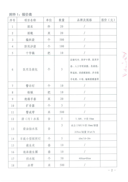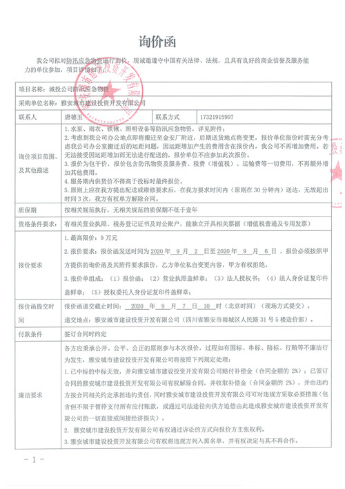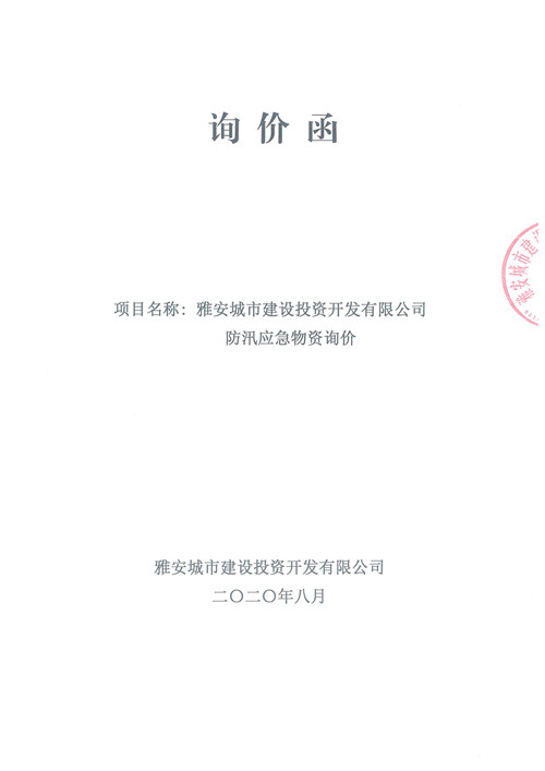 雅安城市建設投資開發(fā)有限公司防汛應急物資詢價函
