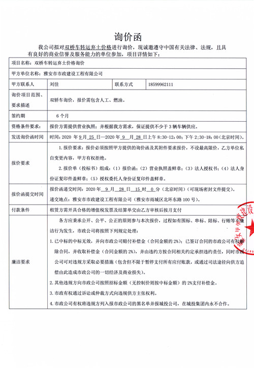 市政公司雙橋車轉(zhuǎn)運(yùn)棄土價(jià)格詢價(jià)函