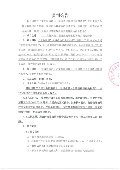 城投房地產(chǎn)公司“文曲新座項目土地增值稅等相關(guān)稅費(fèi)清算”工作競爭性談判公告