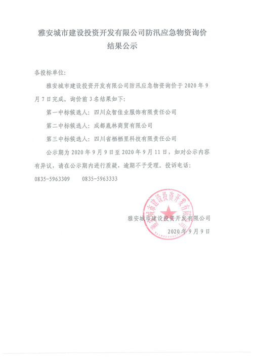 雅安城市建設投資開發(fā)有限公司防汛應急物資詢價結(jié)果公示