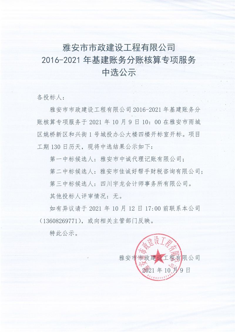 雅安市市政建設工程有限公司2016-2021年基建賬務分賬核算專項服務中選公示