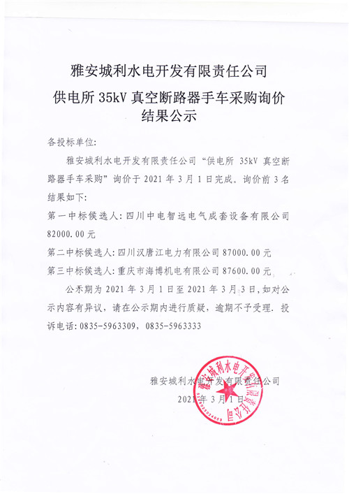 城利水電公司供電所35kV真空斷路器手車(chē)采購(gòu)詢(xún)價(jià)結(jié)果公示