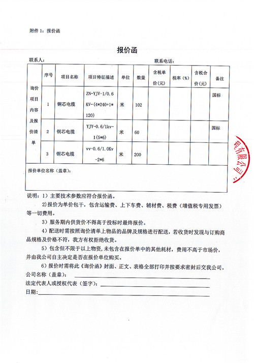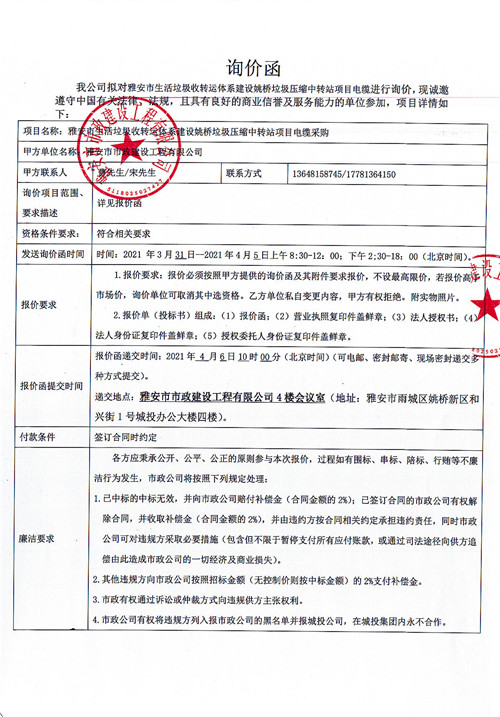 雅安市生活垃圾收轉運體系建設姚橋垃圾壓縮中轉站項目電纜采購詢價函
