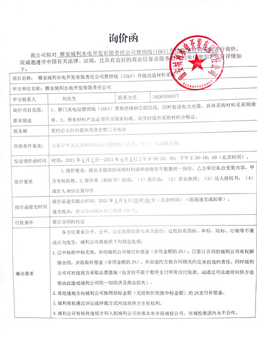雅安城利水電開發(fā)有限責(zé)任公司禁壩線(10kv)升級(jí)改造材料采購詢價(jià)函