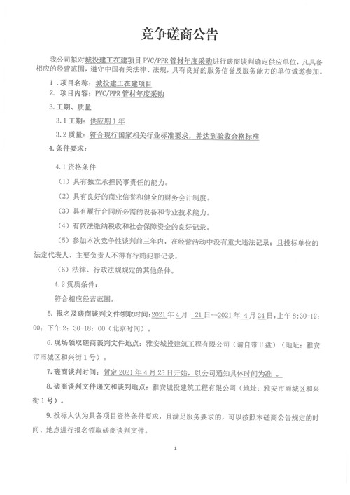 城投建工在建項(xiàng)目PVC/PPR管材年度采購磋商公告