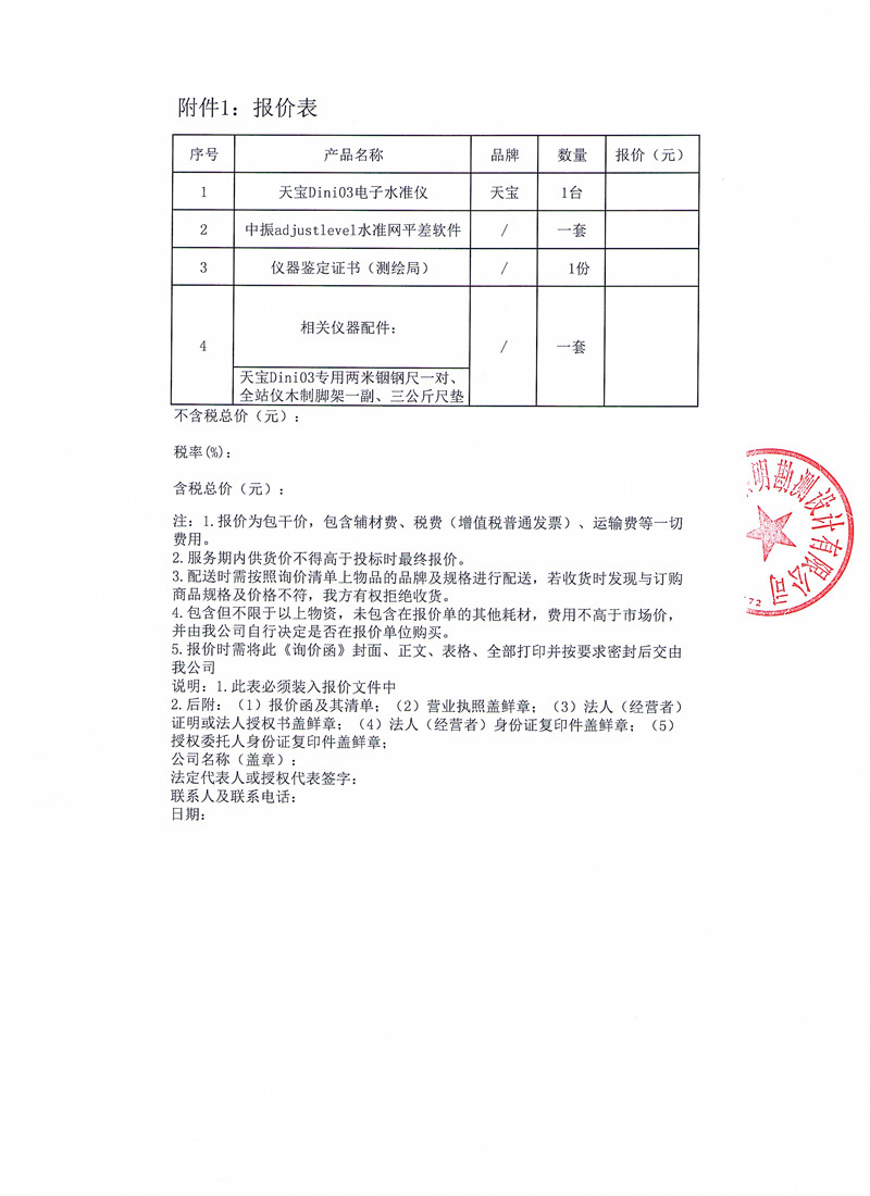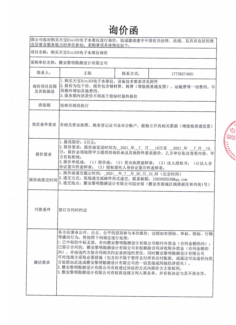黎明勘測公司關于購買天寶Dini03電子水準儀的詢價函