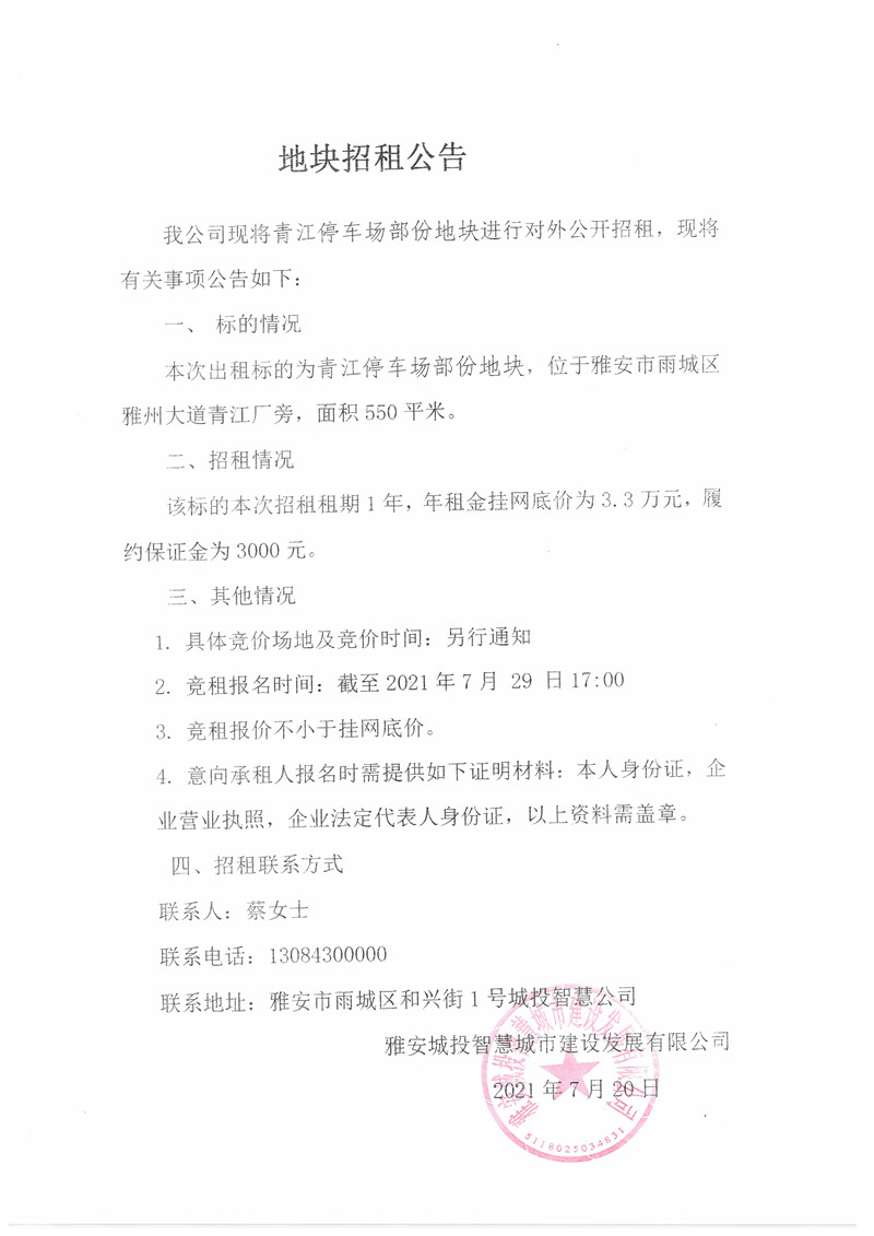 城投智慧公司青江停車場(chǎng)部分地塊招租公告(550㎡)