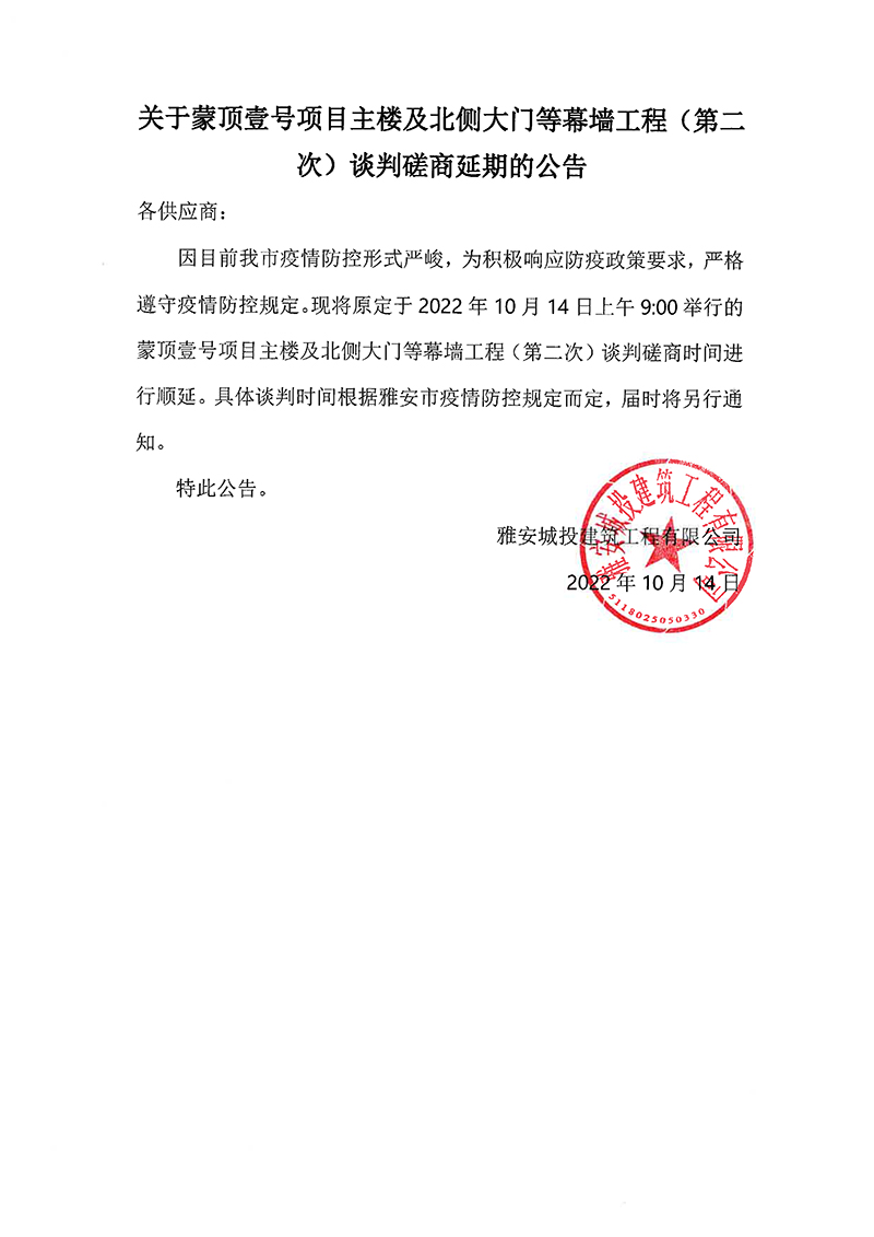 蒙頂壹號(hào)項(xiàng)目主樓及北側(cè)大門(mén)等幕墻工程(第二次)談判磋商延期的公告