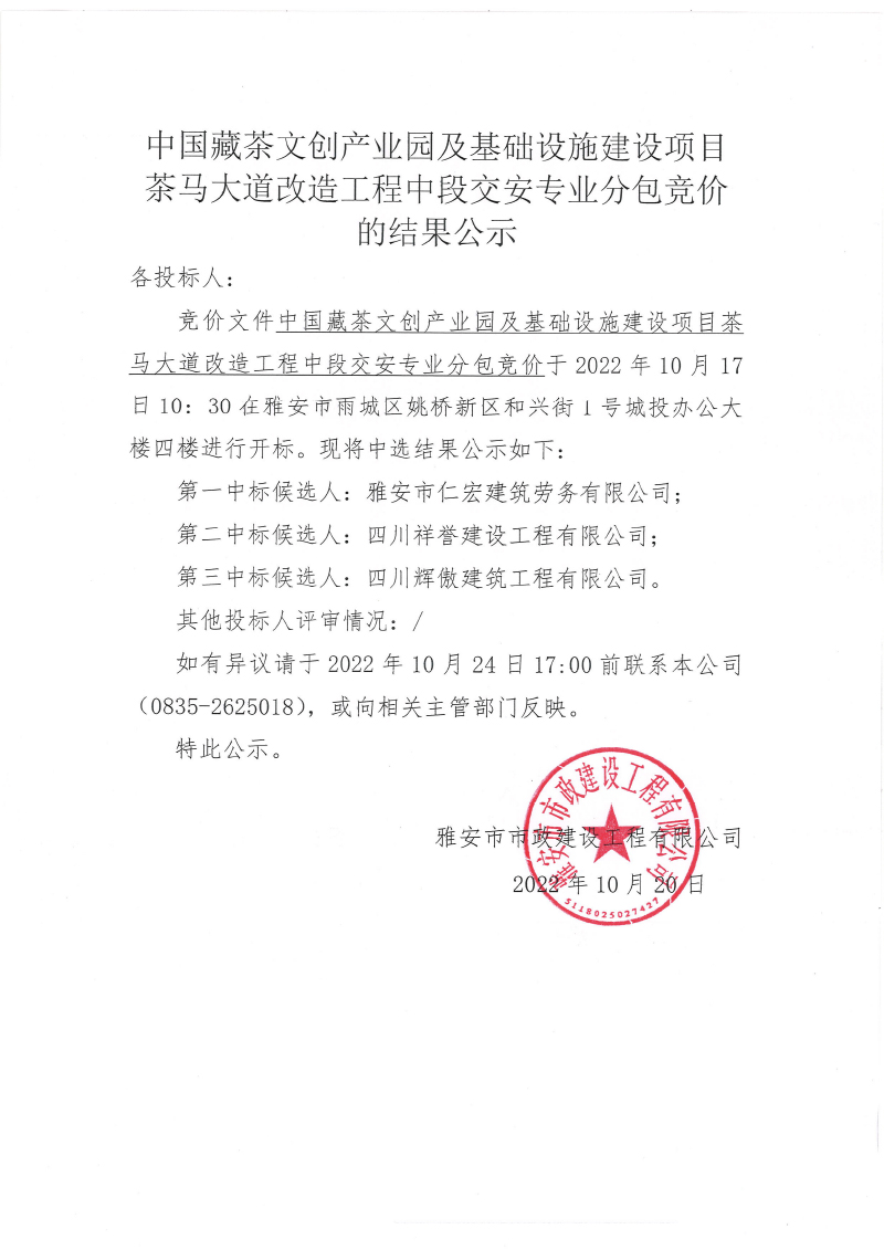 中國藏茶文創(chuàng)產(chǎn)業(yè)園及基礎(chǔ)設(shè)施建設(shè)項(xiàng)目茶馬大道改造工程中段交安專業(yè)分包競價的結(jié)果公示