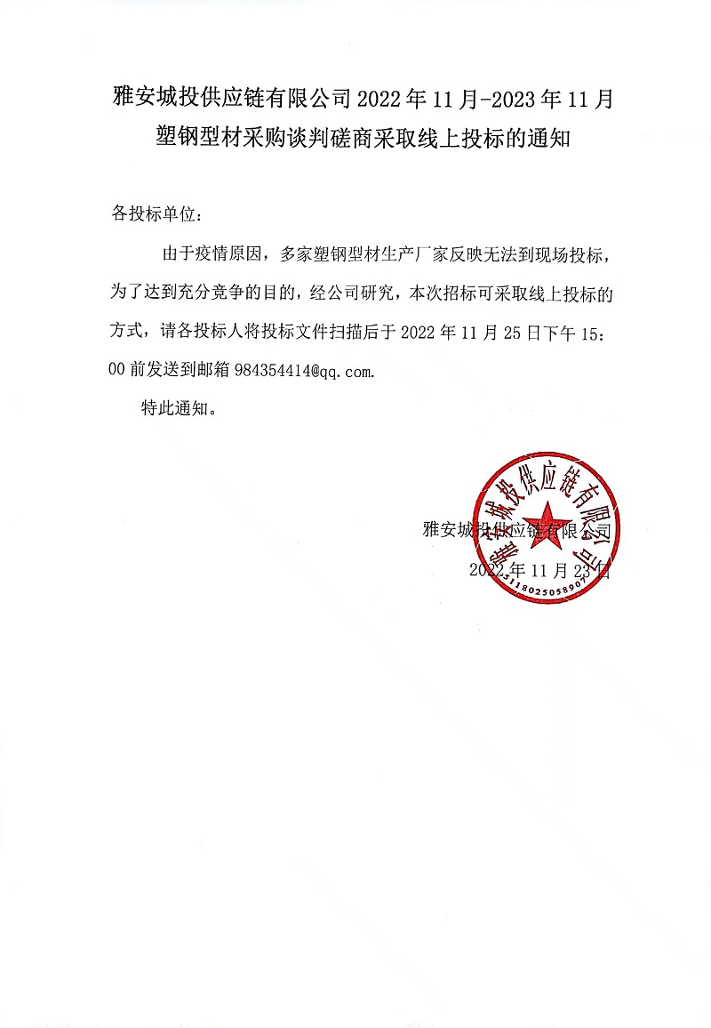 雅安城投供應(yīng)鏈有限公司2022年11月-2023年11月塑鋼型材采購談判磋商采取線上投標(biāo)的通知
