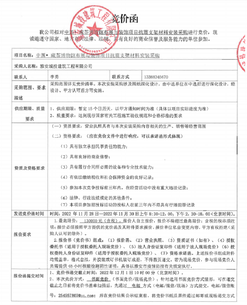 中國藏茶博物館布展與裝飾項(xiàng)目抗震支架材料安裝競(jìng)價(jià)公告