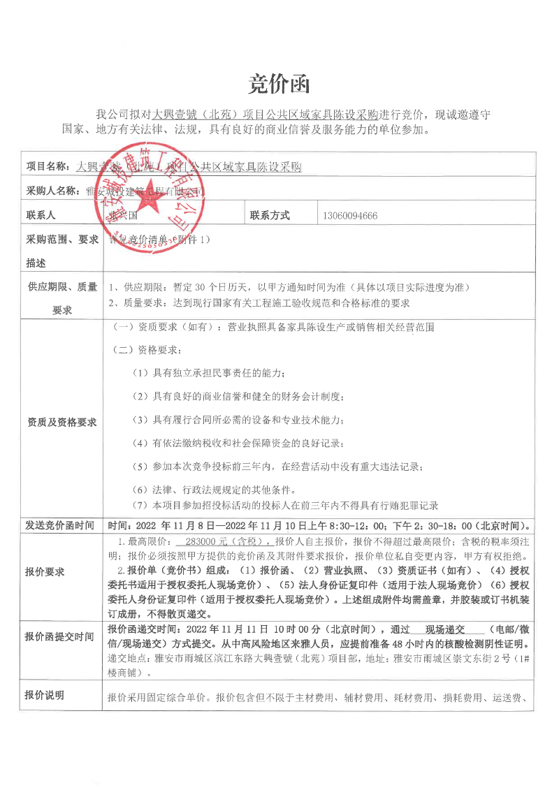 大興壹號(北苑)項目公共區(qū)域家具陳設采購競價函
