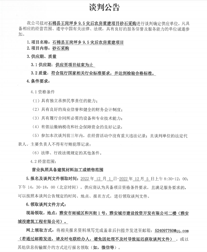 石棉縣王崗坪鄉(xiāng)9.5災(zāi)后農(nóng)房重建項目砂石采購談判公告