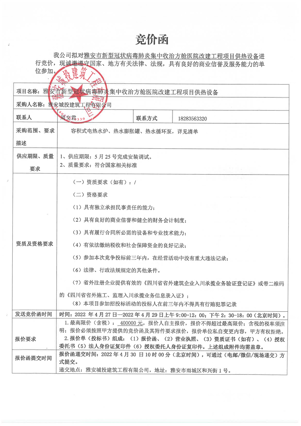 雅安市新型冠狀病毒肺炎集中收治方艙醫(yī)院改建工程項目供熱設(shè)備競價函