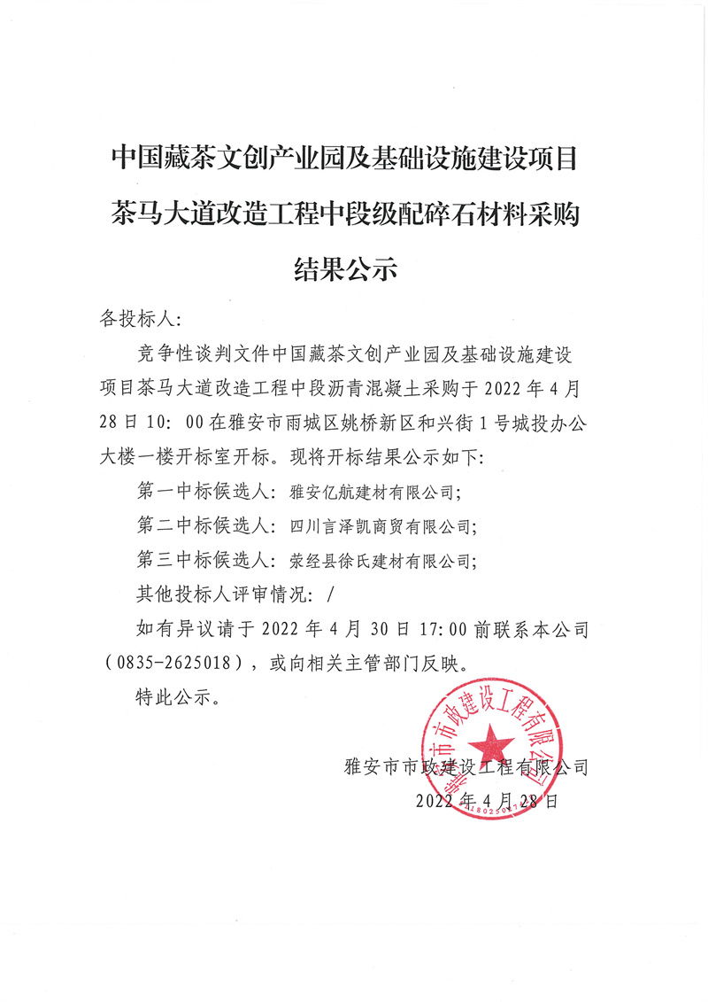 中國(guó)藏茶文創(chuàng)產(chǎn)業(yè)園及基礎(chǔ)設(shè)施建設(shè)項(xiàng)目茶馬大道改造工程中段級(jí)配碎石材料采購(gòu)結(jié)果公示