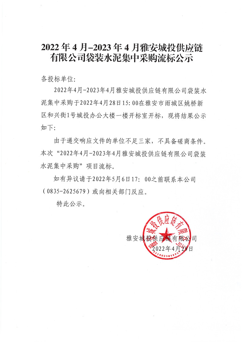 2022年4月-2023年4月雅安城投供應(yīng)鏈有限公司袋裝水泥集中采購(gòu)流標(biāo)公示