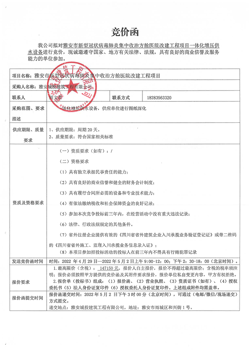 雅安市新型冠狀病毒肺炎集中收治方艙醫(yī)院改建工程項(xiàng)目一體化增壓供水設(shè)備競價(jià)函