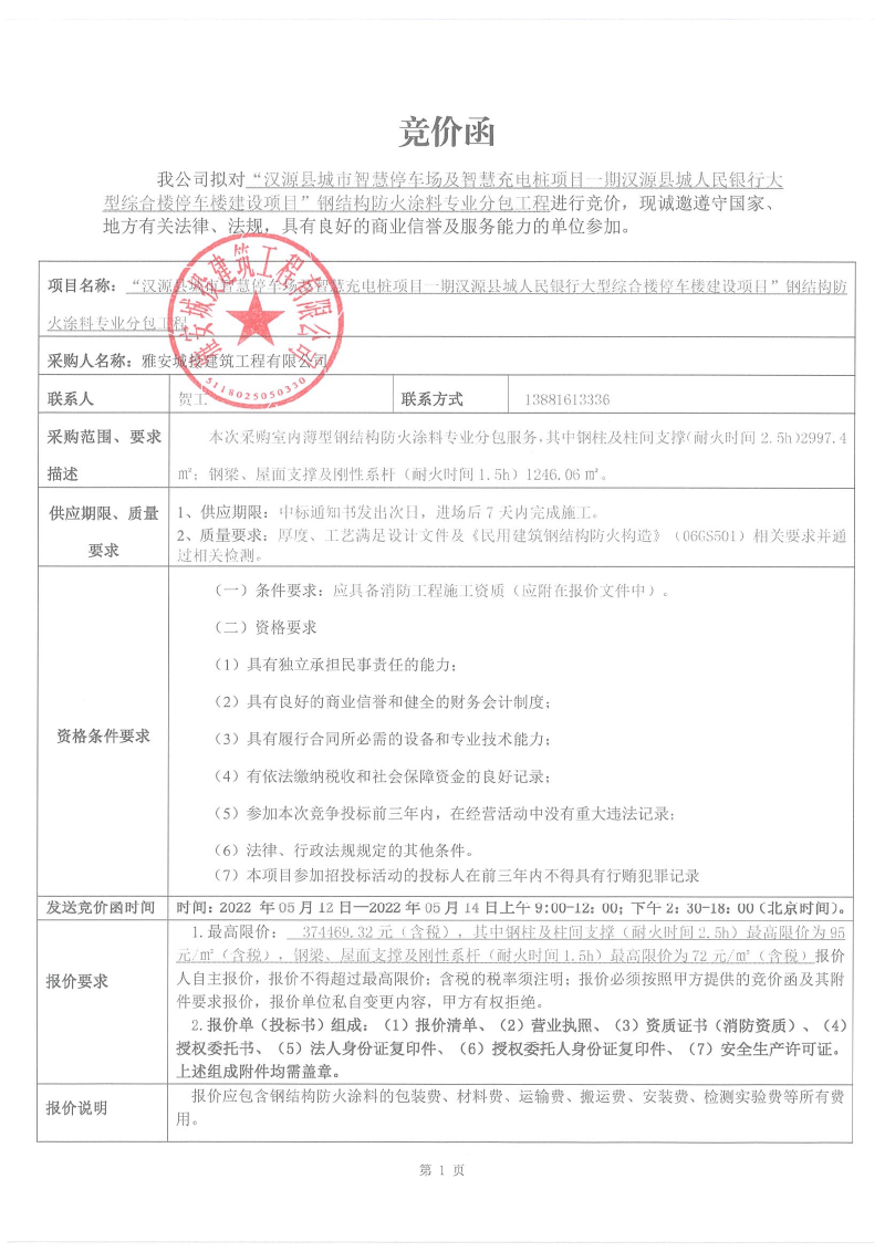 漢源縣城市智慧停車場及智慧充電樁項(xiàng)目一期漢源縣城人民銀行大型綜合樓停車樓建設(shè)項(xiàng)目防火涂料專業(yè)分包競價采購公告
