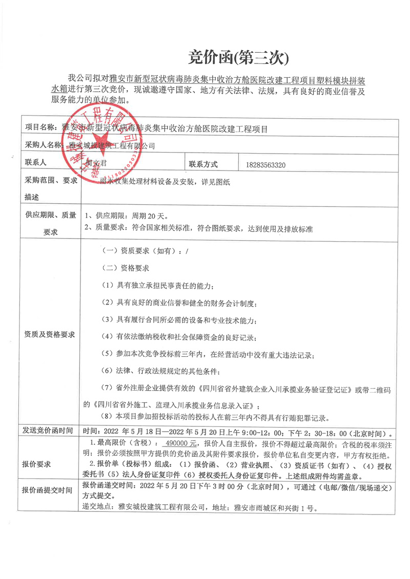 雅安市新型冠狀病毒肺炎集中收治方艙醫(yī)院改建工程項目塑料模塊拼裝水箱競價函(第三次)