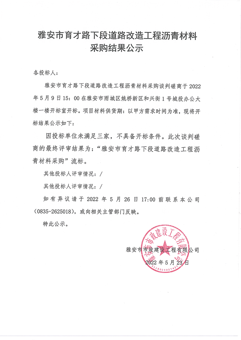 雅安市育才路下段道路改造工程瀝青材料采購(gòu)結(jié)果公示