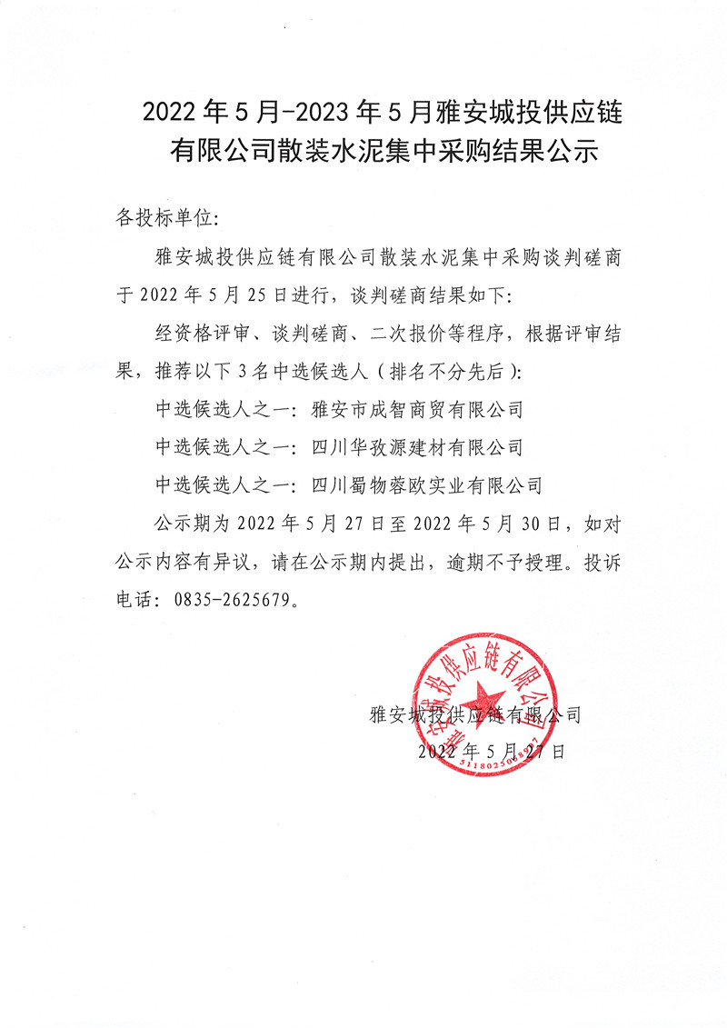 2022年5月-2023年5月雅安城投供應鏈有限公司散裝水泥采購結果公示