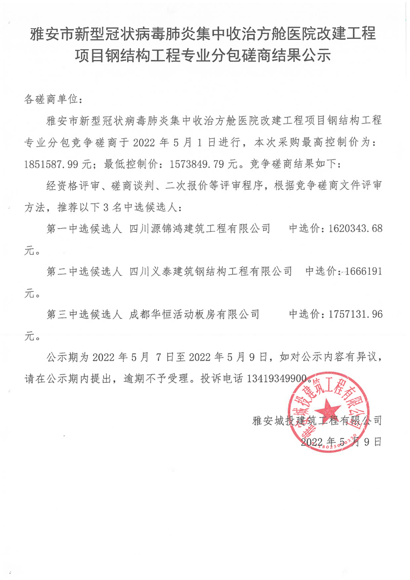 雅安市新型冠狀病毒肺炎集中收治方艙醫(yī)院改建工程項目鋼結(jié)構(gòu)工程專業(yè)分包磋商結(jié)果公示