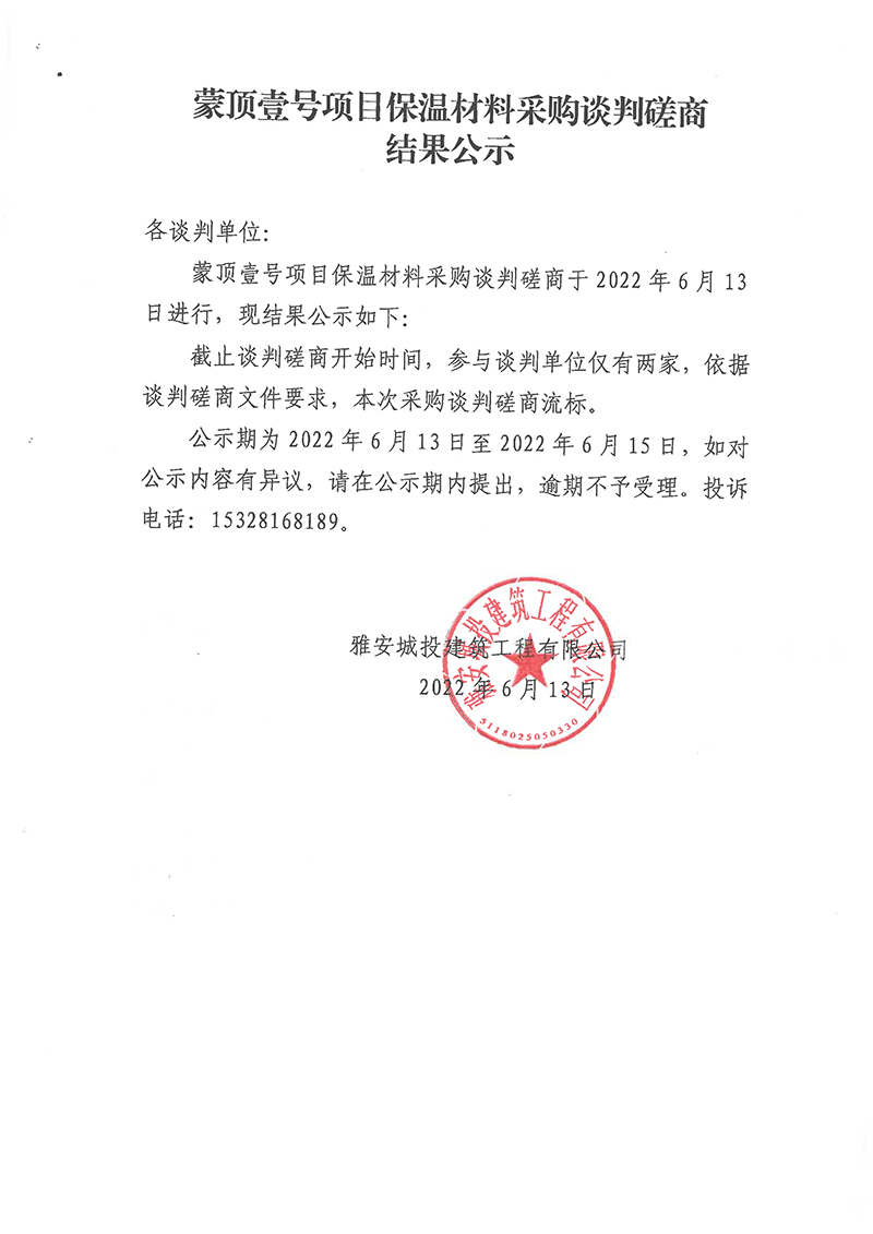 蒙頂壹號項目保溫材料采購談判磋商結(jié)果公示