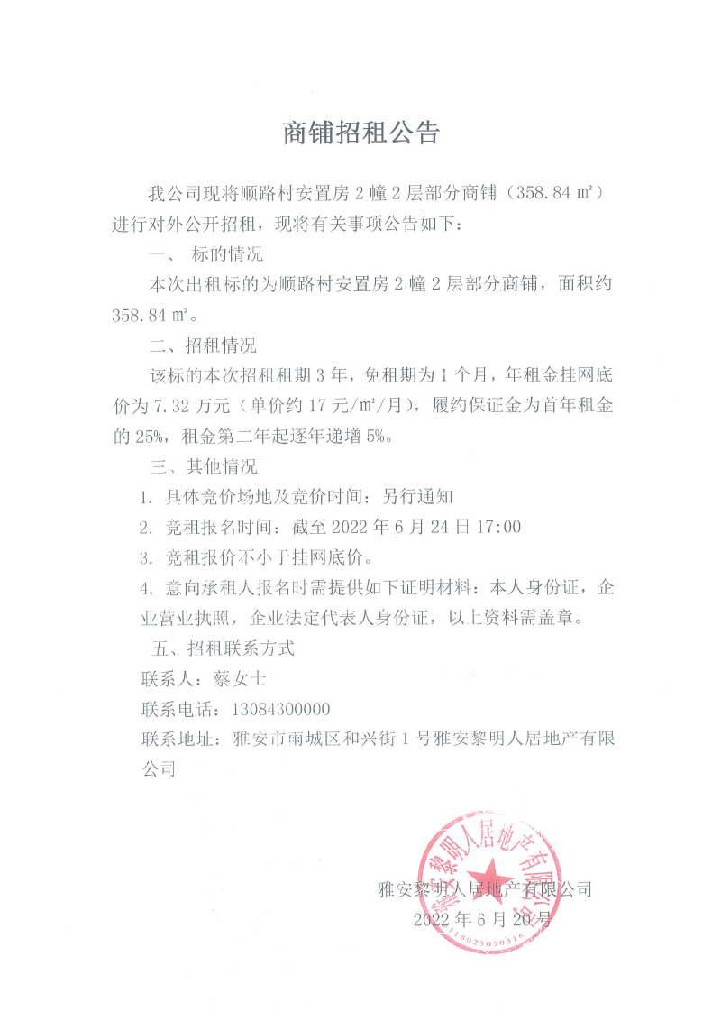 順路村安置房2幢2層部分商鋪招租公告