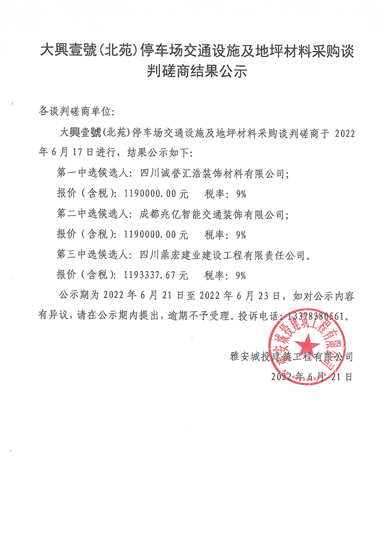 大興壹號(hào)(北苑)停車(chē)場(chǎng)交通設(shè)施及地坪材料采購(gòu)談判磋商結(jié)果公示