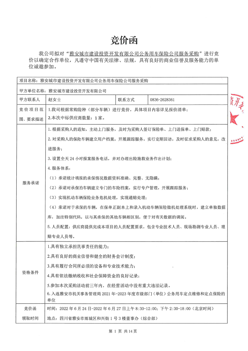 雅安城市建設(shè)投資開(kāi)發(fā)有限公司公務(wù)用車保險(xiǎn)公司服務(wù)采購(gòu)競(jìng)價(jià)公告