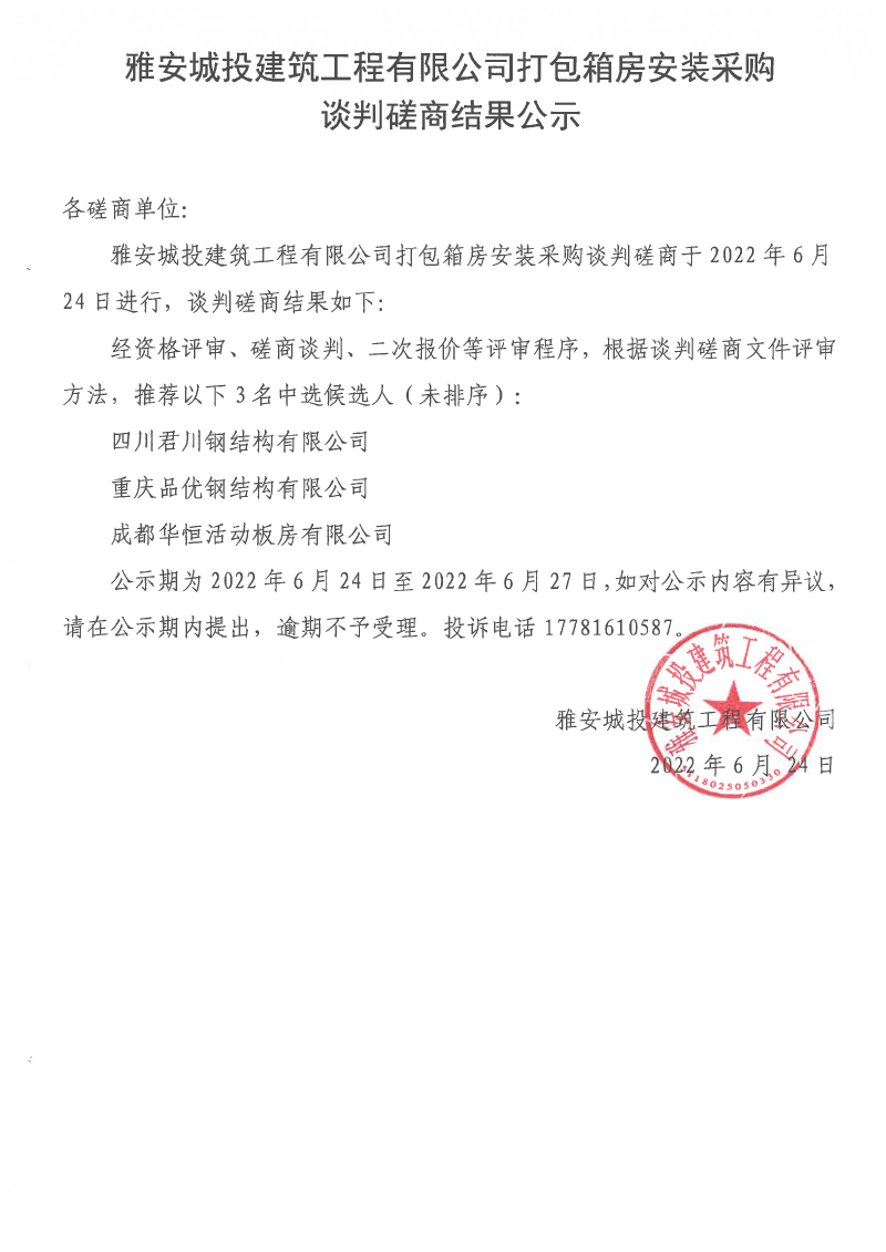 雅安城投建筑工程有限公司打包箱房安裝采購(gòu)談判磋商結(jié)果公示