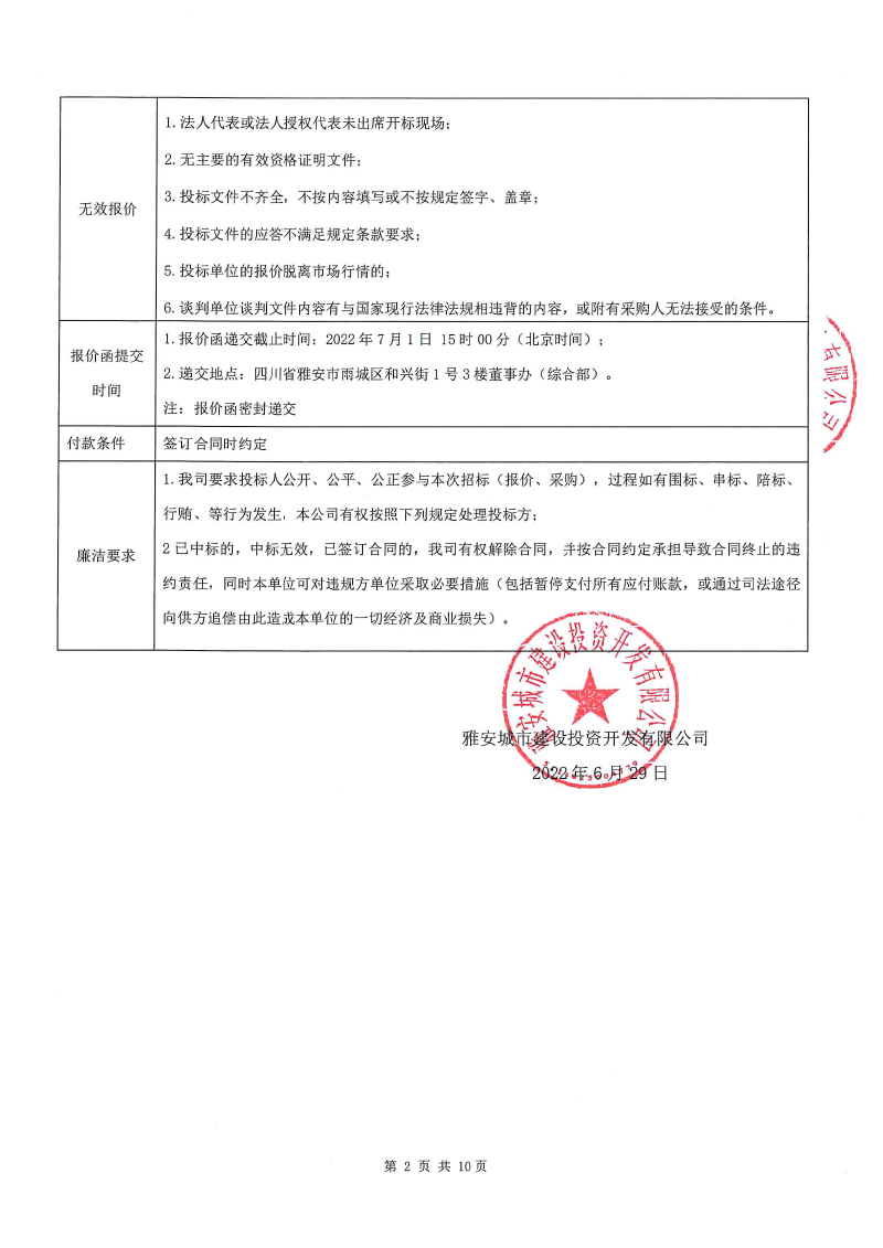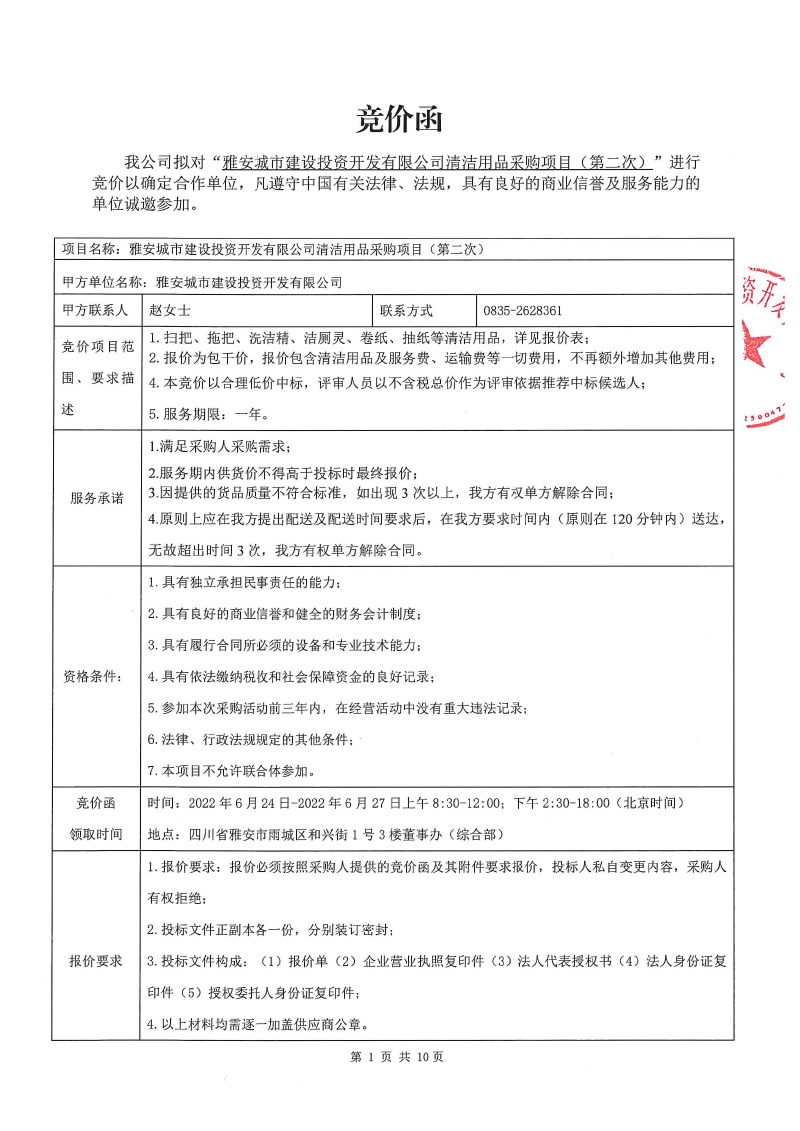 雅安城市建設(shè)投資開發(fā)有限公司 清潔用品采購項(xiàng)目(第二次)競價公告