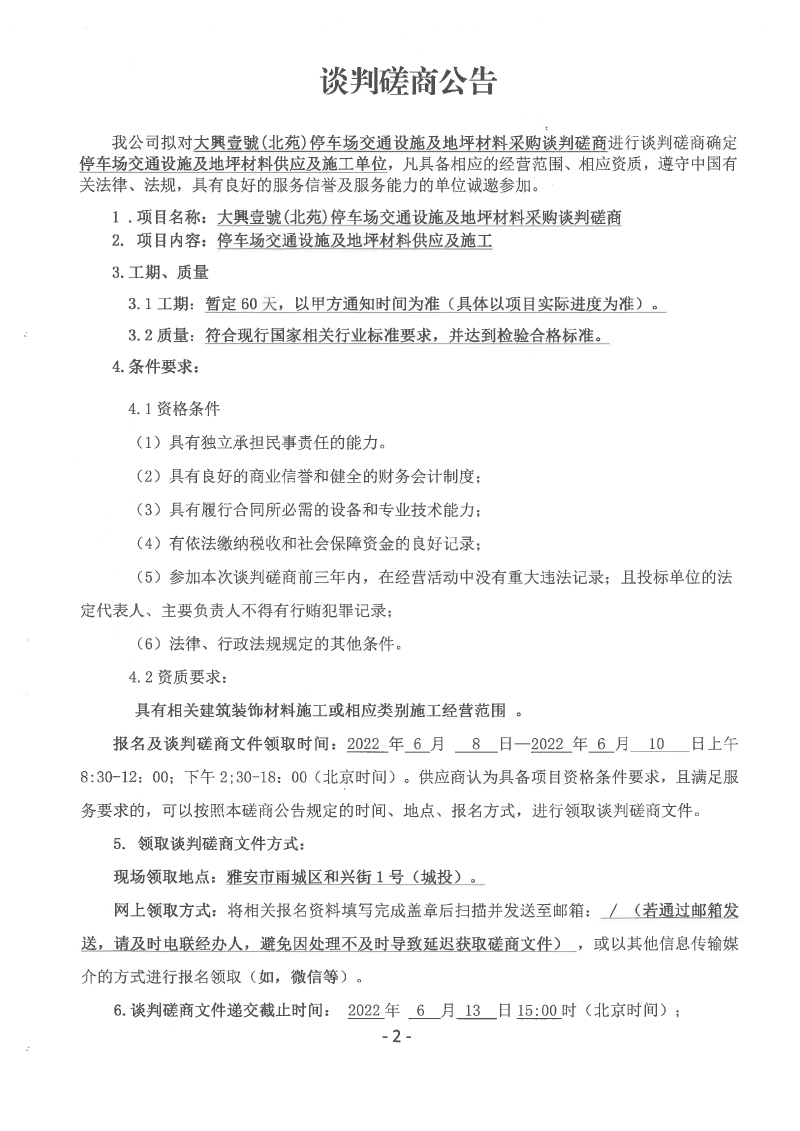 大興壹號(hào)(北苑)停車場(chǎng)交通設(shè)施及地坪材料采購談判磋商公告