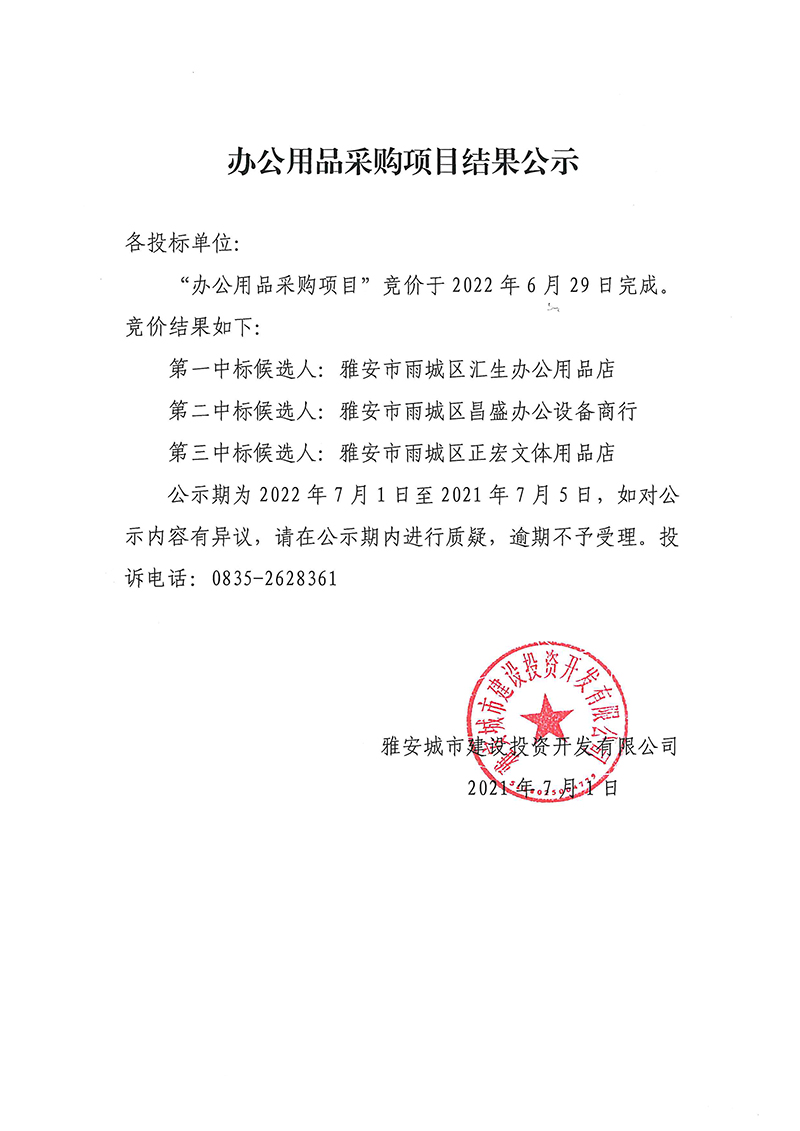 雅安城市建設(shè)投資開發(fā)有限公司辦公用品采購項(xiàng)目競價(jià)結(jié)果公示
