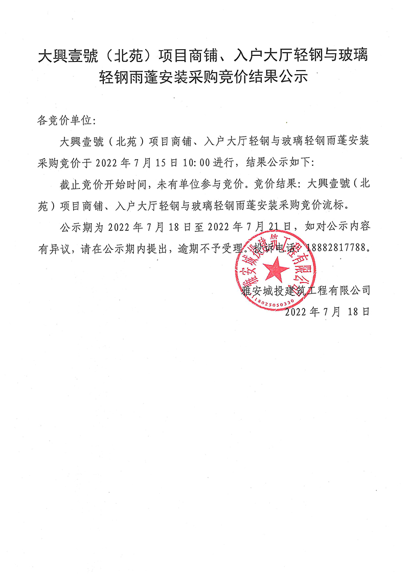大興壹號(北苑)項(xiàng)目商鋪、入戶大廳輕鋼與玻璃輕鋼雨蓬安裝采購競價(jià)結(jié)果公示