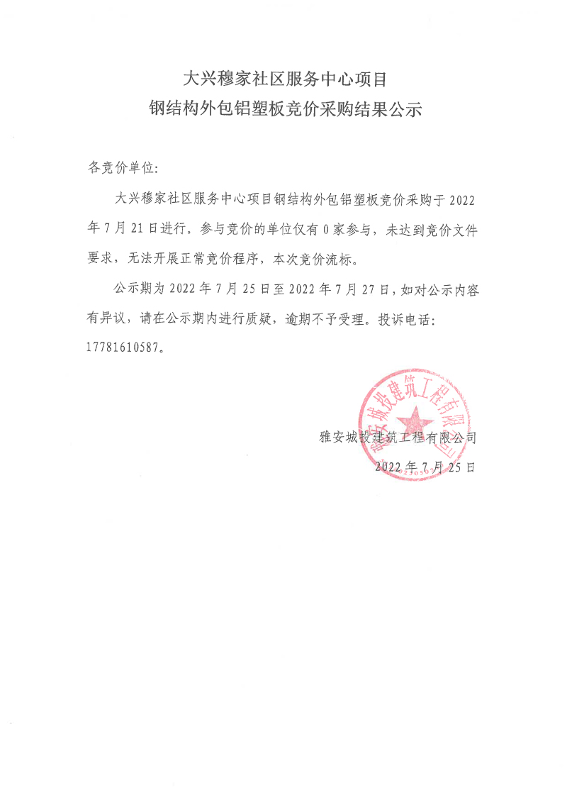 大興穆家社區(qū)服務中心項目鋼結構外包鋁塑板競價采購結果公示