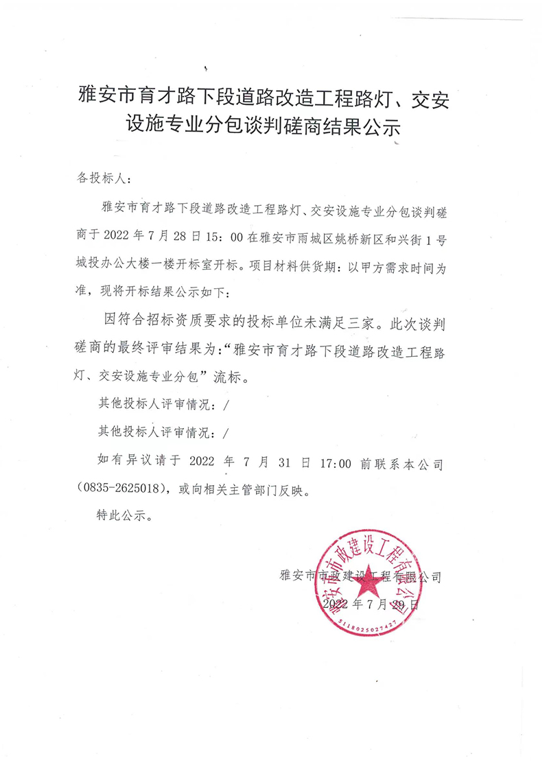 雅安市育才路下段道路改造工程路燈、交安設(shè)施專(zhuān)業(yè)分包談判磋商結(jié)果公示