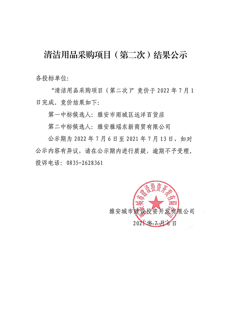 雅安城市建設(shè)投資開(kāi)發(fā)有限公司清潔用品采購(gòu)項(xiàng)目(第二次)結(jié)果公示